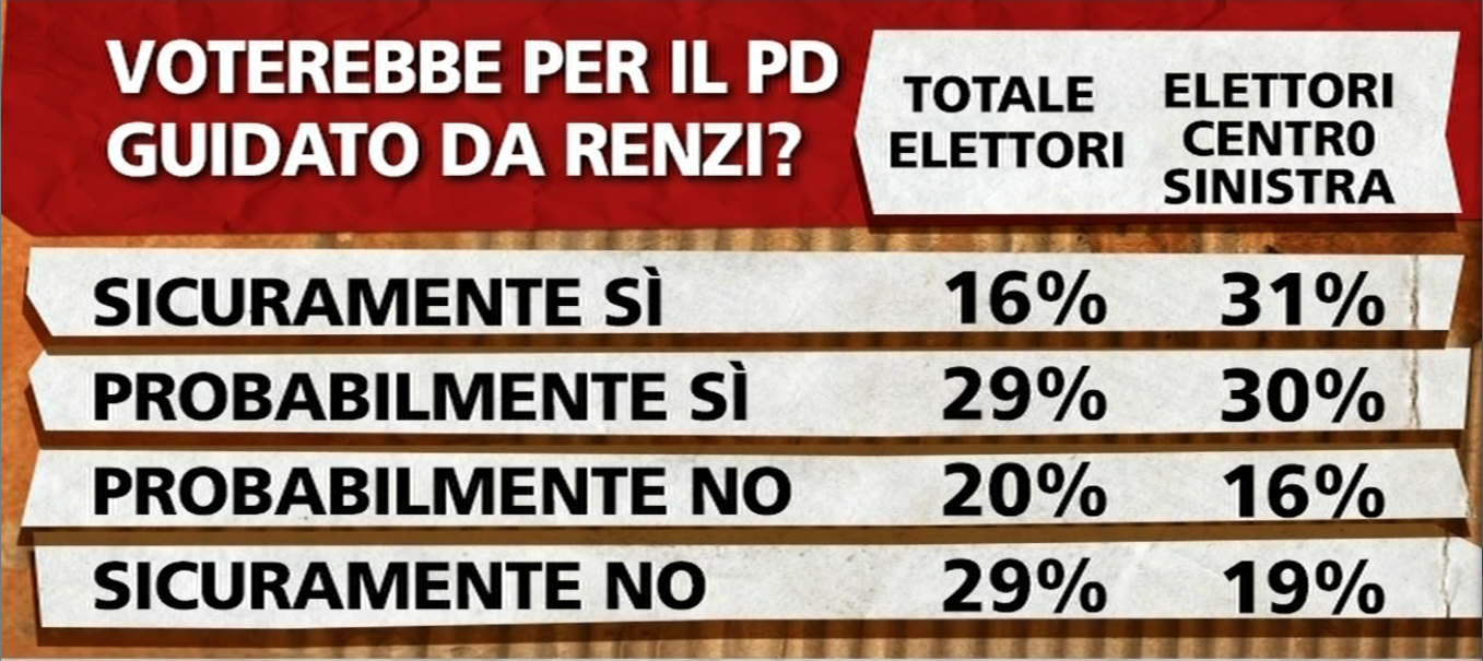 Tuttavia, il dato citato da Renzi non e’ preciso alla luce delle seguenti considerazioni: se sommiamo le categorie che hanno dichiarato “sicuramente si” e “probabilmente si” alla domanda: “Voterebbe per il Pd guidato da Renzi?” vediamo che il sindaco di Firenze otterrebbe un 45% dei voti (piu’ quindi di quanto da lui stesso dichiarato), mentre il segretario racimolerebbe il 37% dei consensi (non il 25% come detto da Renzi). Certo, sempre di proiezioni si tratta, e le risposte definitive le avremo solo ad elezione avvenuta. In questo scenario e con i dati a nostra disposizione, però, diamo un “ni” a Renzi giustificato da un distacco riscontrabile, certo, ma supportato con percentuali un po’ “ballerine”.