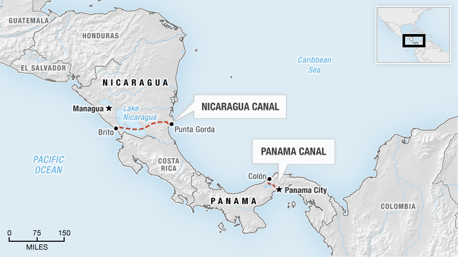 A luglio di quest’anno una commissione composta da ufficiali governativi, imprenditori ed accademici ha approvato il percorso del Canale di Nicaragua, che dovrebbe passare per il lago di Nicaragua (vedi mappa) ed estendersi per 278 chilometri. I lavori dovrebbero iniziare quest’anno stesso e finire nel 2019. Il progetto è un pallino dell’attuale Presidente Daniel Ortega e le stime del governo indicano che il Canale avrebbe effetti economici molto positivi, prevedendo un aumento del 30% del Pil da qui al 2018.