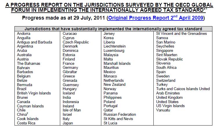 Dal 2009 il Forum Globale sulla trasparenza e sullo scambio delle informazioni per fini fiscali dell’Ocse raggruppa i Paesi in tre categorie: (i) una lista dei cattivi, in cui sono ricompresi gli Stati o i territori che non si sono impegnati a rispettare gli standard internazionali; (ii) una lista degli Stati che si sono impegnati a rispettare gli standard internazionali ma che hanno siglato meno di dodici accordi in conformità a questi standard; (iii) la lista “bianca” che include i Paesi o le giurisdizioni che hanno sostanzialmente seguito le regole internazionali.